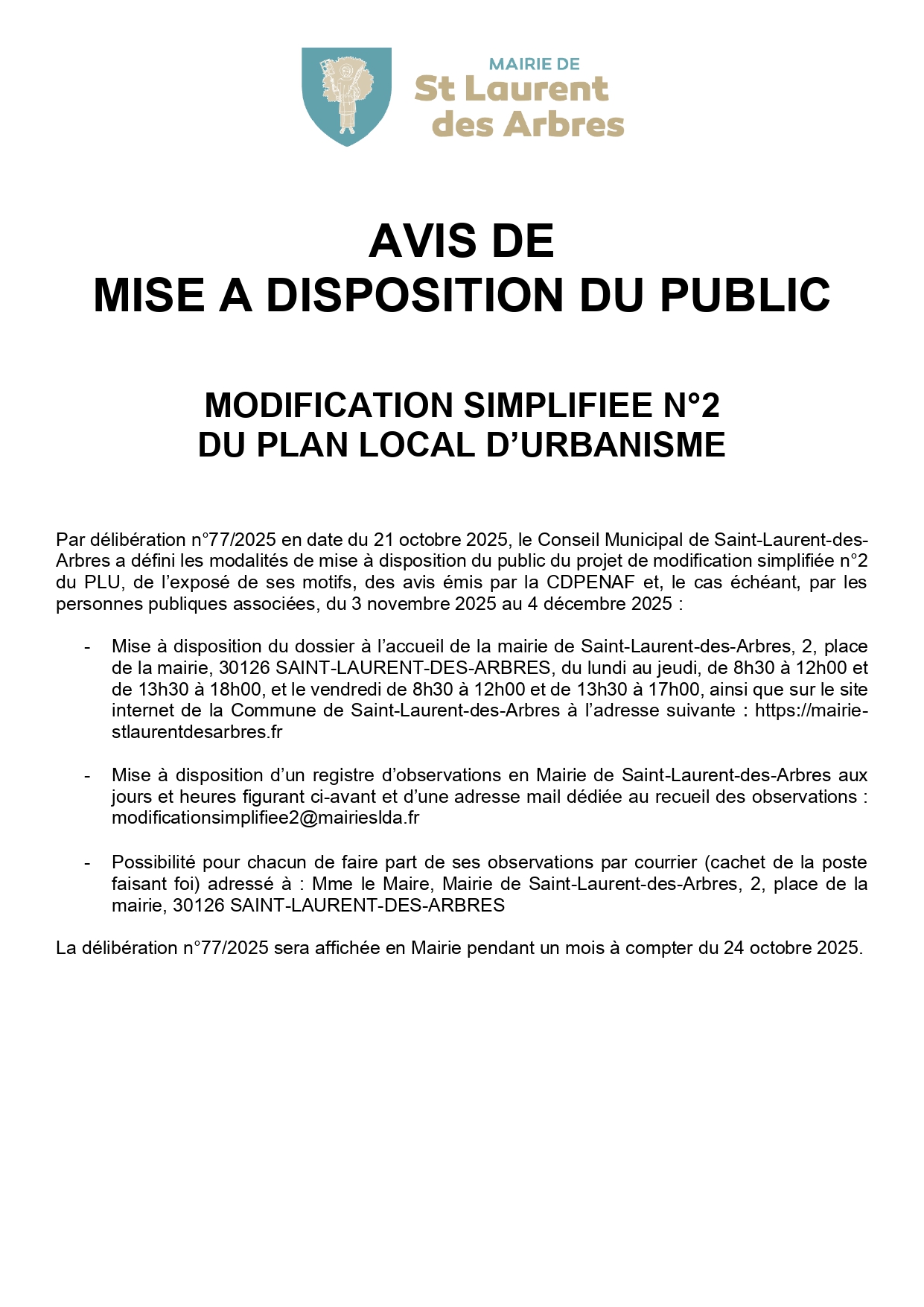 Par délibérations n°75/2025 et n°76/2025 en date du 21 octobre 2025, le Conseil Municipal de Saint-Laurent-des-Arbres a défini les modalités de mise à disposition du public des projets de modification simplifiée n°1 et n°2 du Plan Local d’Urbanisme (PLU).