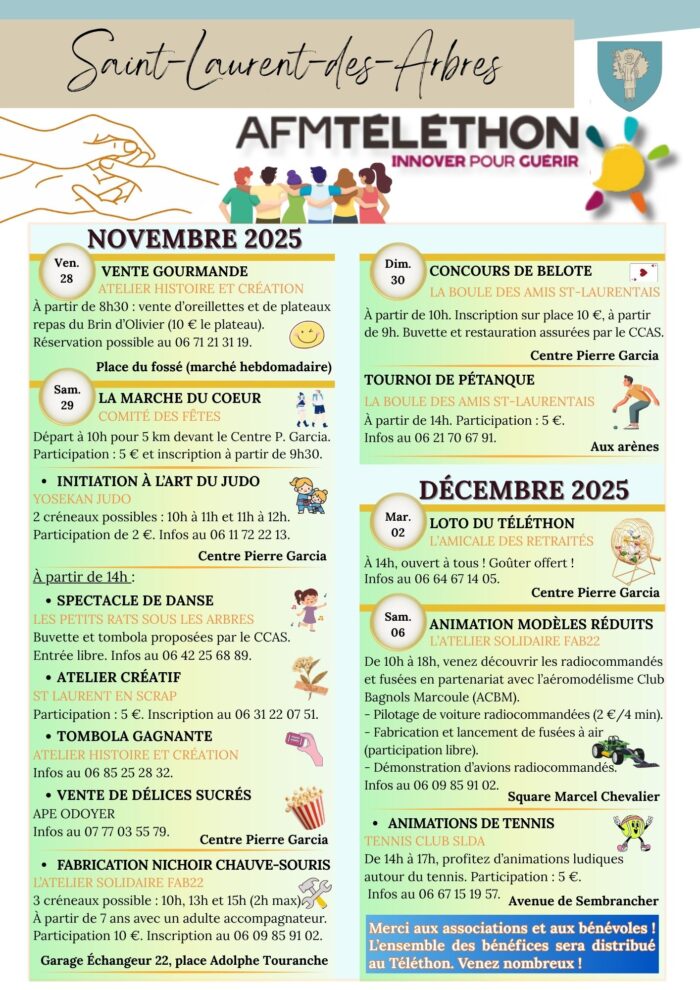 Du vendredi 28 novembre au samedi 6 décembre 2025, Saint-Laurent-des-Arbres sera à la page du Téléthon, avec 5 jours de manifestations proposées par 9 associations Saint-Laurentaises mobilisées pour récolter des fonds entièrement reversés au Téléthon.