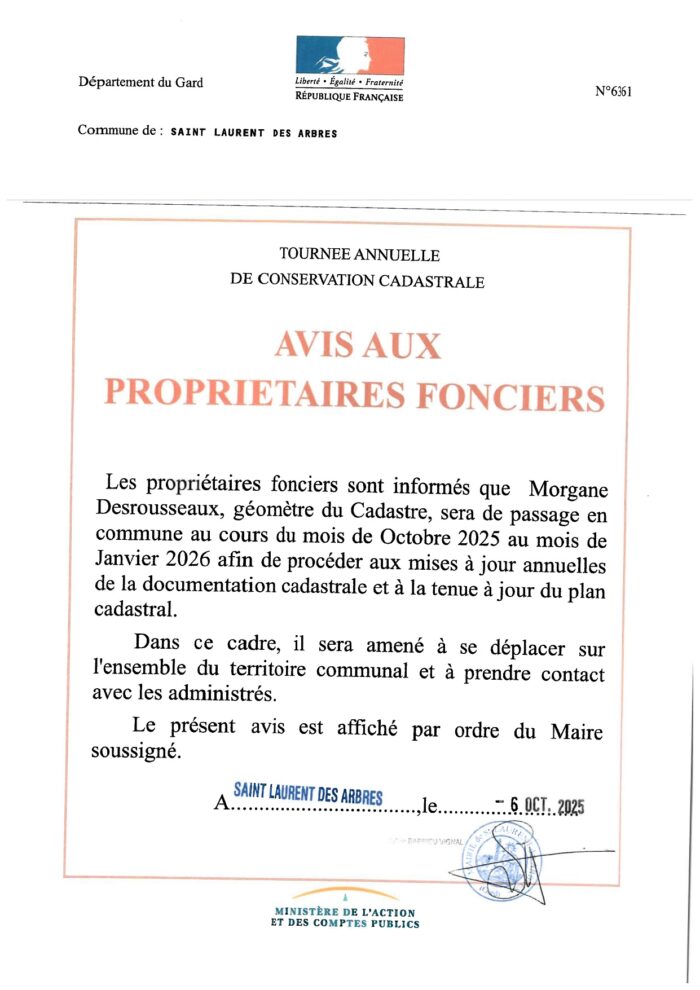 Dans ce cadre, Madame Morgane Desrousseaux, géomètre du cadastre au PTGC-SDIF de Nîmes, effectuera les travaux de conservation cadastrale à Saint-Laurent-des-Arbres à partir du 20 octobre 2025.